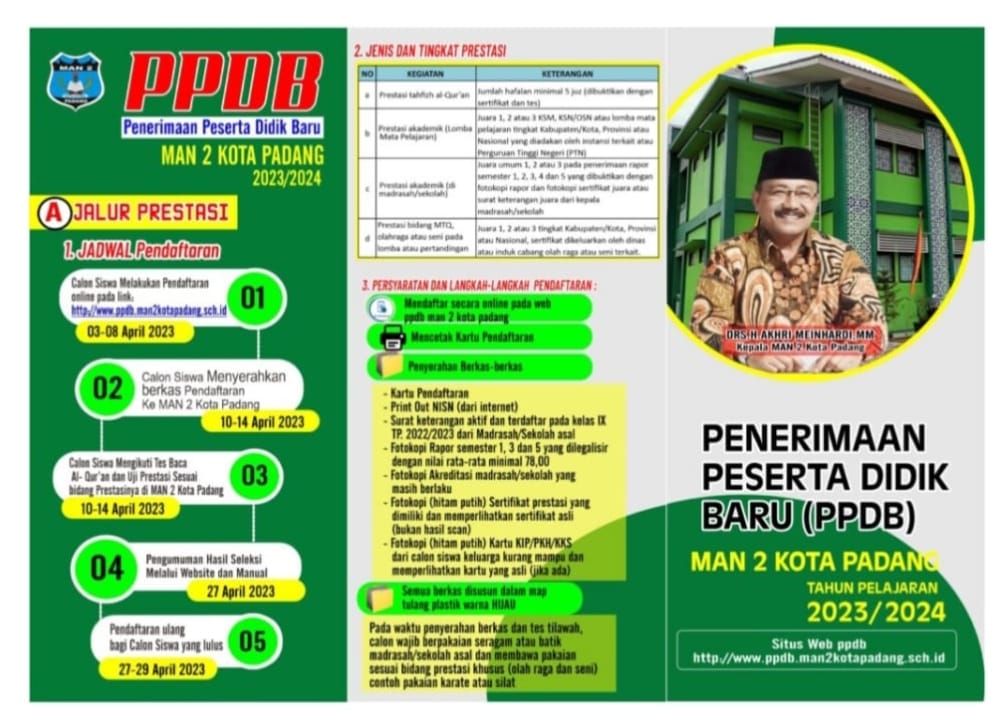 Semua tahapan serta informasi lengkap mengenai penerimaan siswa baru 2023 melalui jalur prestasi dapat lihat melalui brosur dan diakses melalui situs www.man2kotapadang.sch.id/ppdb .