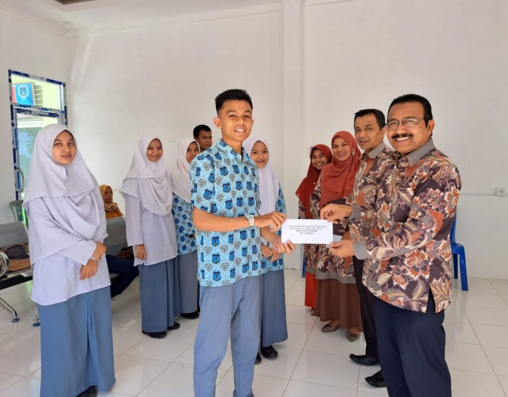 Padang, humas– Kepala madrasah, Akhri Meinhardi menyerahkan zakat dari Badan Amil Zakat Nasional (Baznas) Provinsi Sumbar masing-masing Rp 1 juta kepada 8 siswa MAN 2 Padang. Penyerahan dilakukan di gedung PTSP madrasah tersebut, Kamis (13/04/2023).