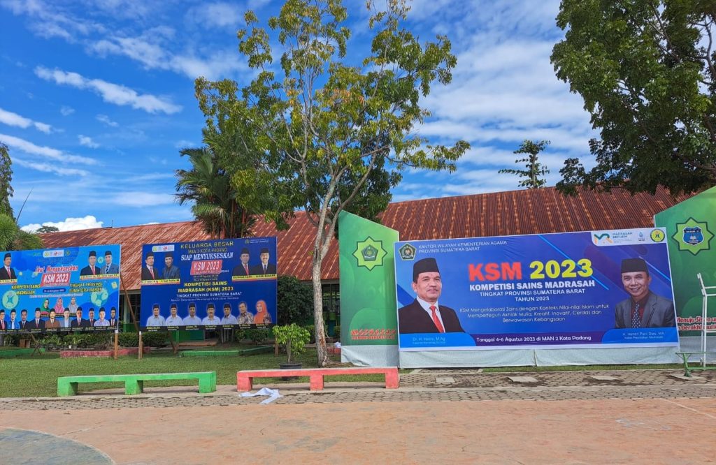 Nampak juga beberapa baliho besar yang berukuran 20 x 30 M yang bertuliskan, “Ikut Menyukseskan Kompetisi Sains Madrasah (KSM) 2023 dari Kelompok Kerja Madrasah Aliyah (KKMA), KKM Mts dan MIN Kemenag Kota Padang.