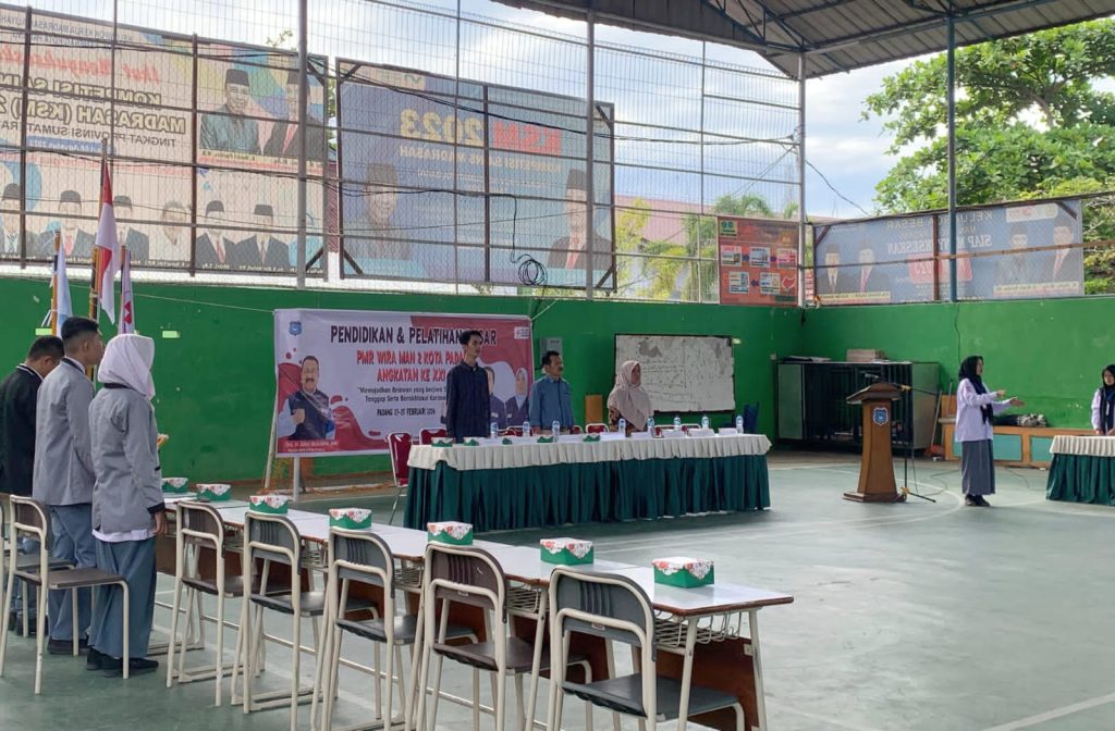 Padang, humas — Kepala madrasah diwakili wakil kepala bidang kesiswaan, Yusmal Yani menutup rangkaian kegiatan Pendidikan dan Latihan Dasar (Diklatsar) Palang Merah Remaja (PMR) Wira MAN 2 Padang di hall madrasah tersebut, Minggu (25/02/2024).