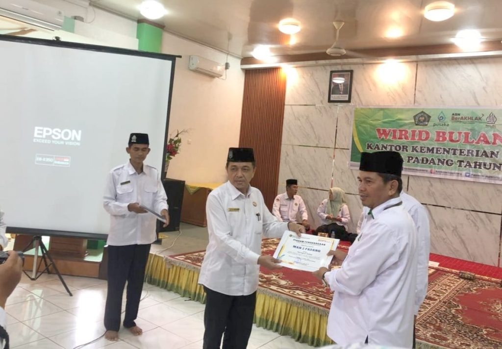 Penghargaan tersebut diserahkan langsung oleh Kepala Kantor Kemenag Kota Padang, Edy Oktafiandi kepada Plt Kepala MAN 2 Padang, Al Anshari, Senin (14/10//2024) di Aula Kemenag Kota Padang.